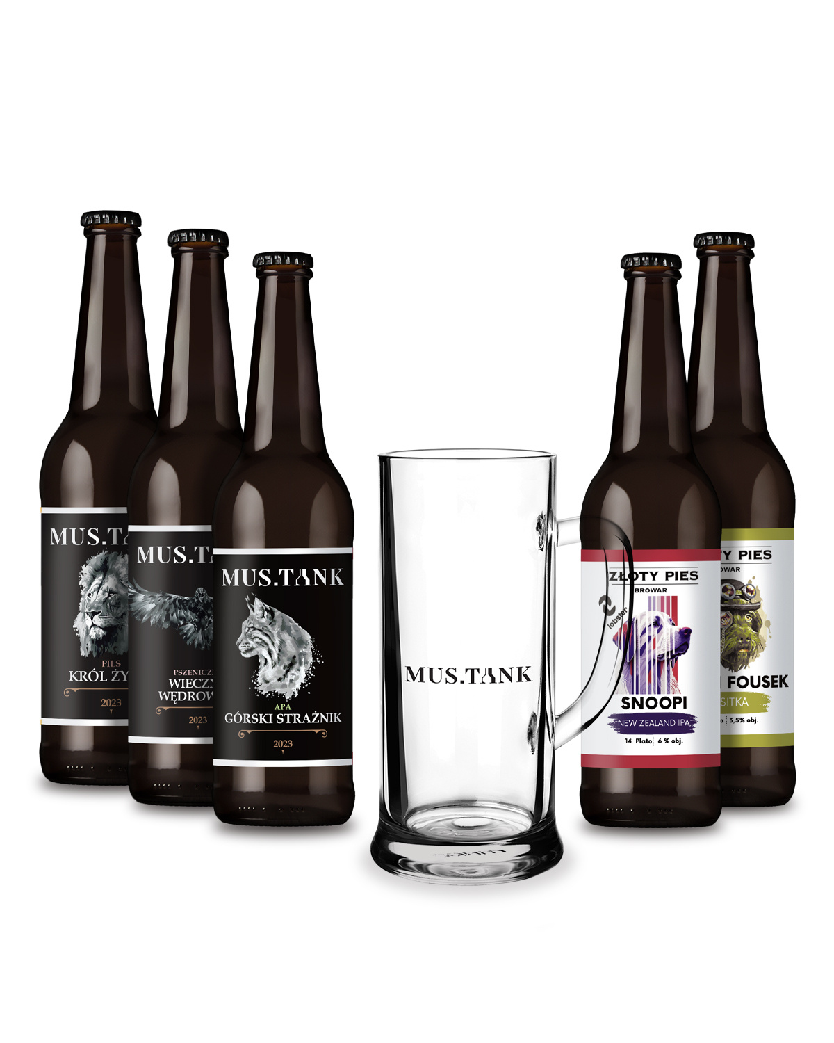 - Zestaw składający się z 5 różnych piw browaru Złoty Pies i Mus.Tank oraz szklanką z logiem Mus.Tank