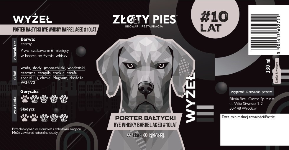 to wyjątkowe wydanie przygotowane z okazji 10-lecia Browaru Złoty Pies. Symbolizuje doświadczenie, pasję i rzemieślniczy kunszt budowany przez lata. Projekt nawiązuje do klasyki gatunku – szlachetnego, głębokiego portera bałtyckiego, który od lat pozostaje jednym z najbardziej cenionych stylów piwnych w Polsce. Limitowana edycja dla kolekcjonerów i miłośników wyjątkowych historii zamkniętych w butelce.